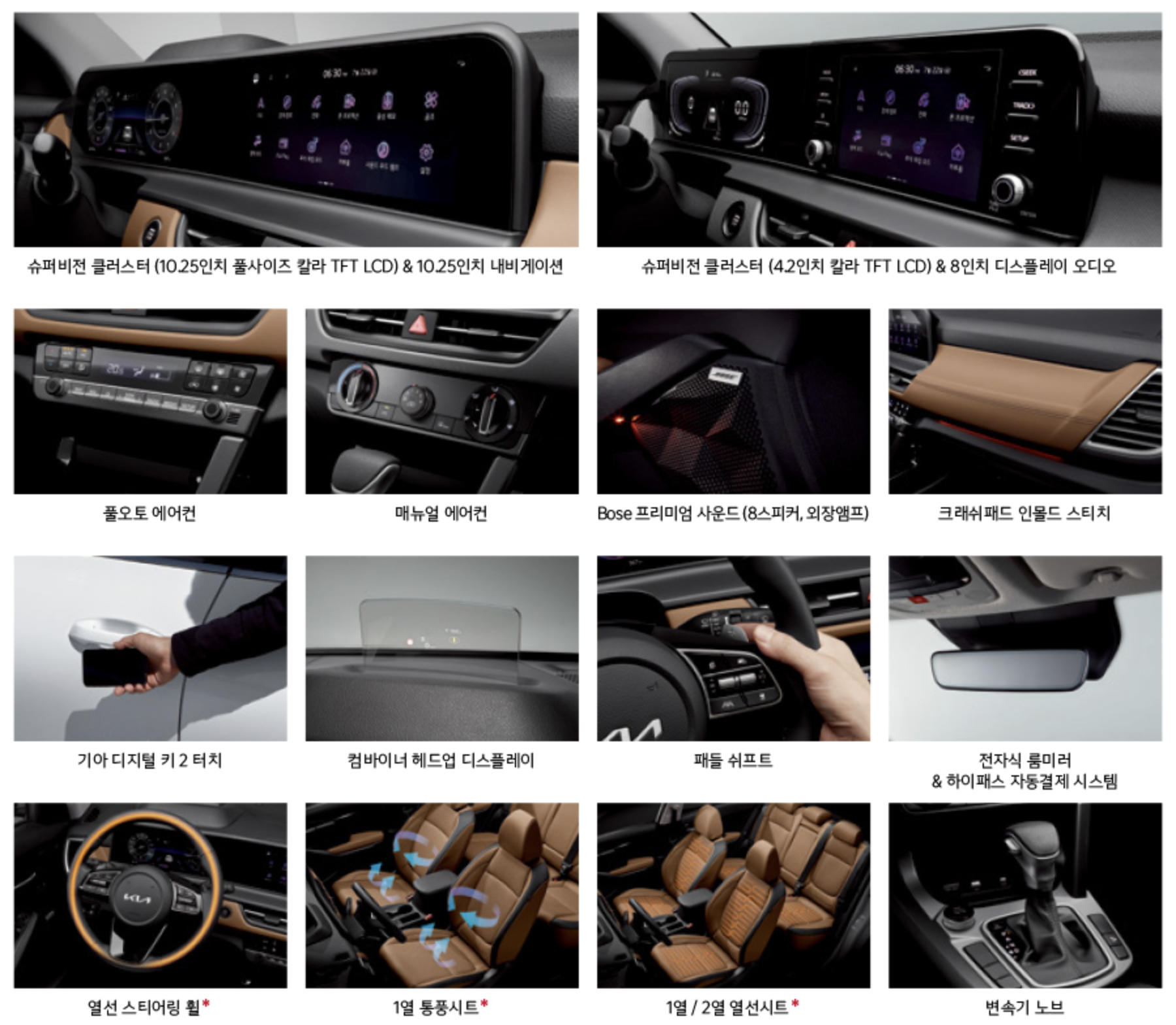 기아 셀토스는 10.25인치 클러스터와 동급의 10.25인치 내비게이션을 연결한 파노라마 디스플레이를 제공합니다. 현대 코나보다 2인치 정도 작은 사이즈입니다. 변속 래버는 다이얼식으로 적용되었고 운전석 메모리 시트와 에어컨 내부 곰팡이를 방지하는 애프터 블로우 기능, 스마트 파워 테일게이트 그리고 디지털키와 빌트인 캠 등 동급의 옵션이 다량 추가되었습니다.