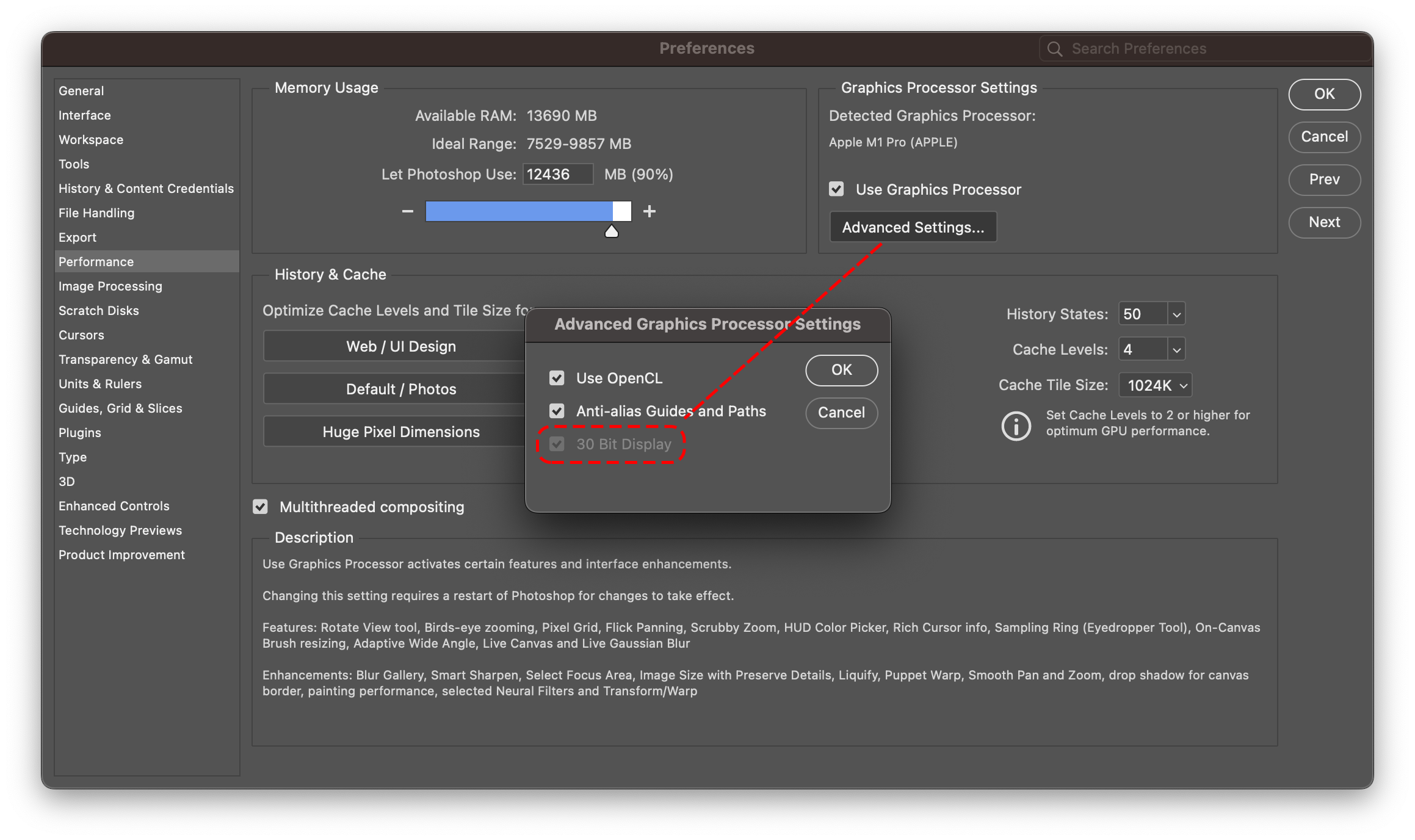 6. Performance(퍼포먼스) - Advanced Settings.. - Drawing Mode 'Advanced' / 30Bit Display '체크'