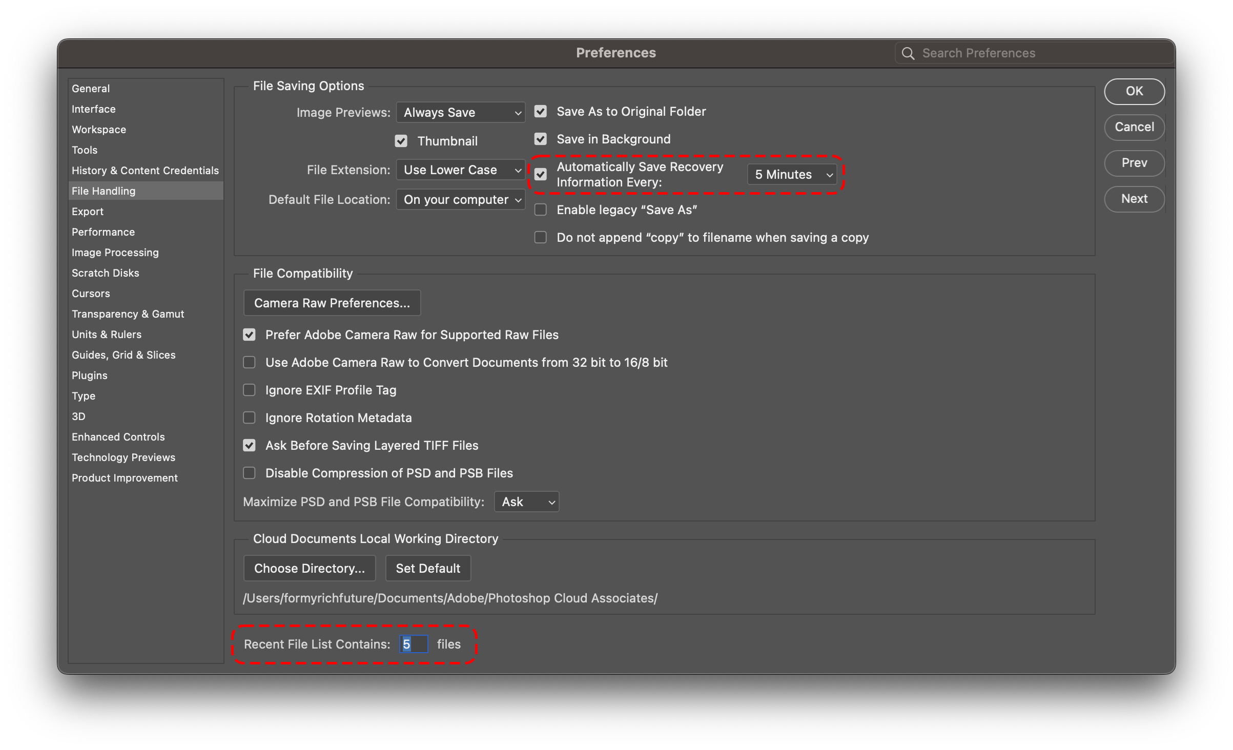4. File Handling(파일핸들링) - Automatically Save Recovery Information Every : '5' Minutes