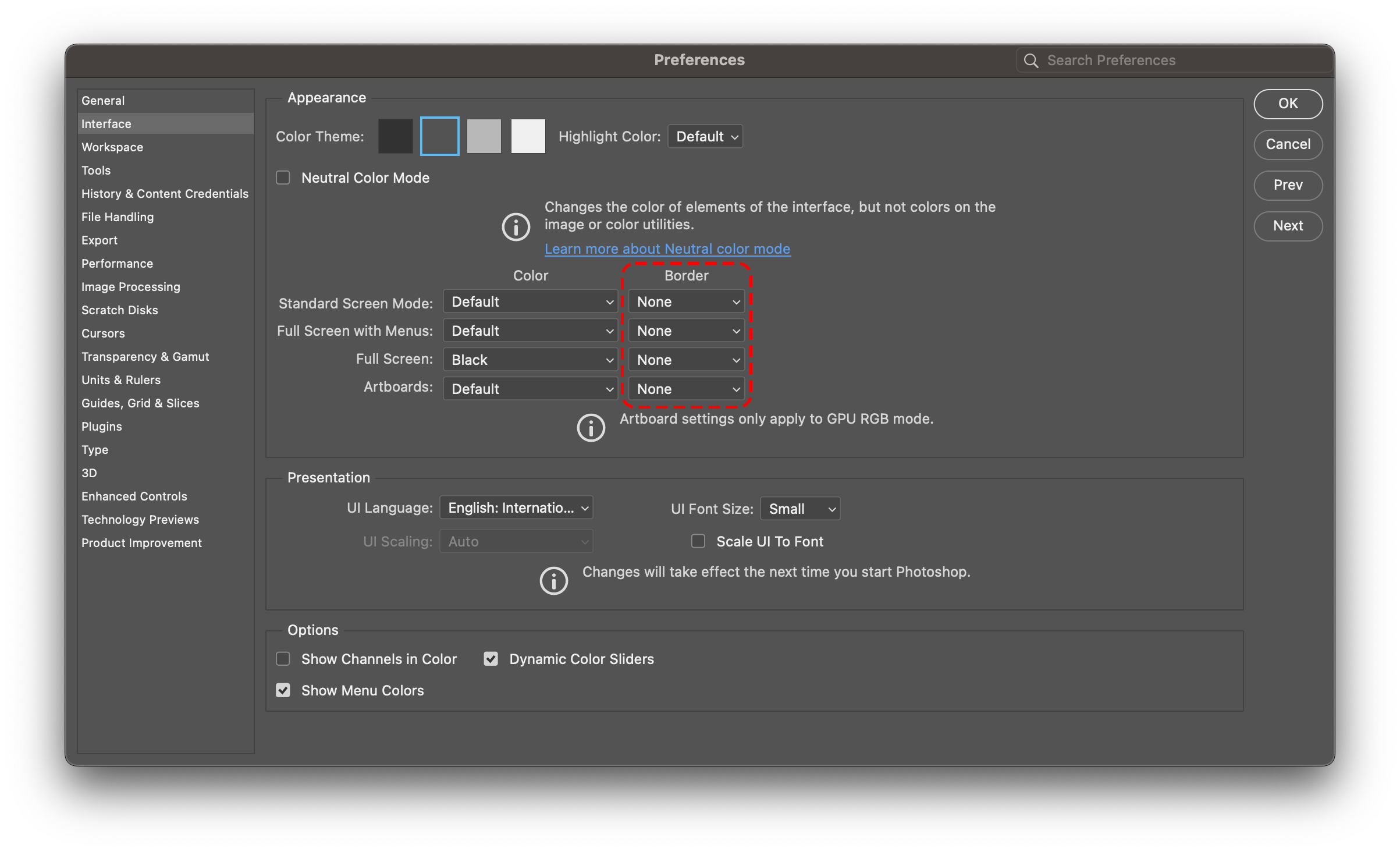2. Interface(인터페이스) - Start Screen Mode / Full Screen With Menus / Full Screen / Artboards 'None'