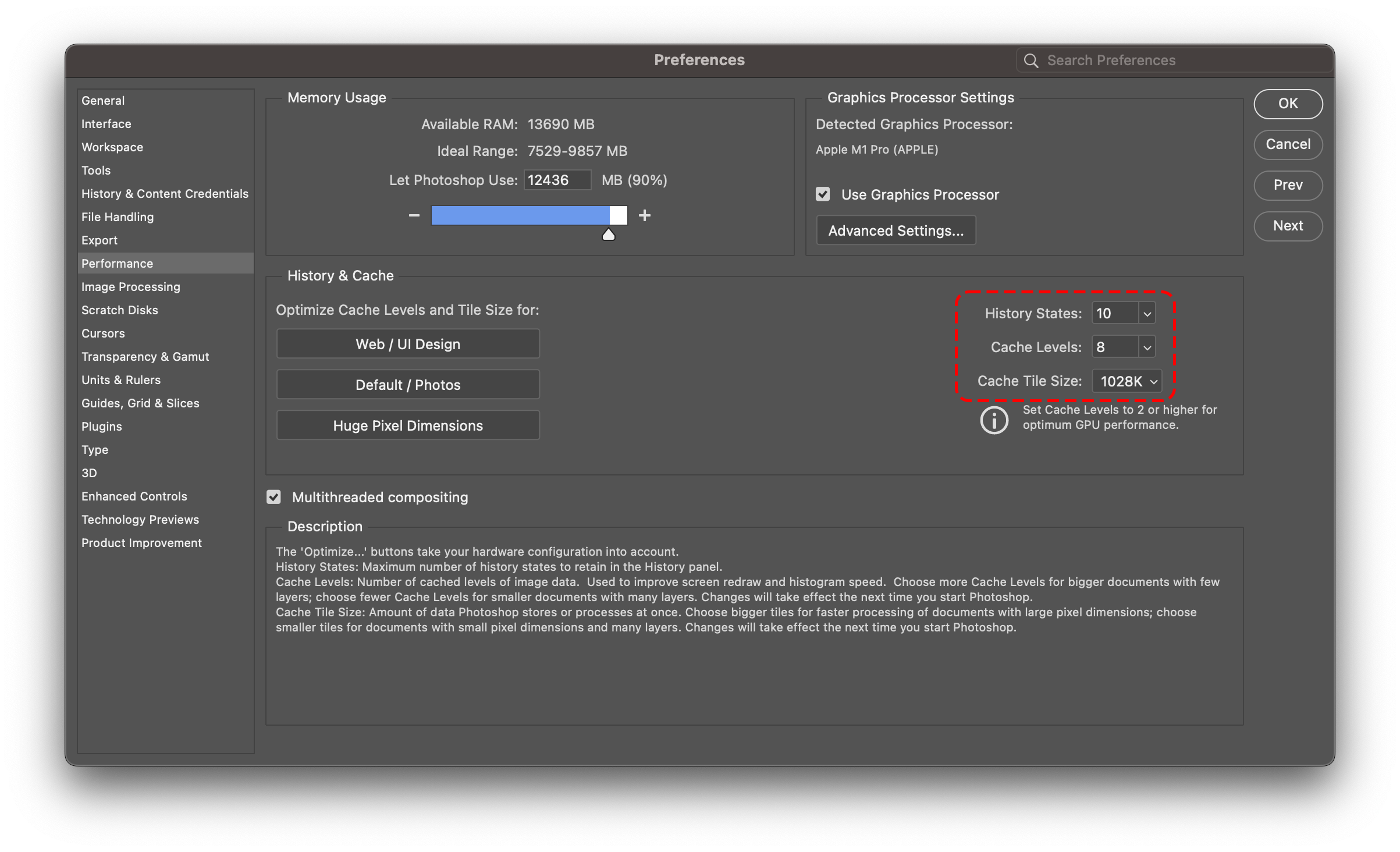 - 퍼포먼스 설정#3 : Performance - History States '10' / Cache Level '8' / Cache Title Size '1028K'