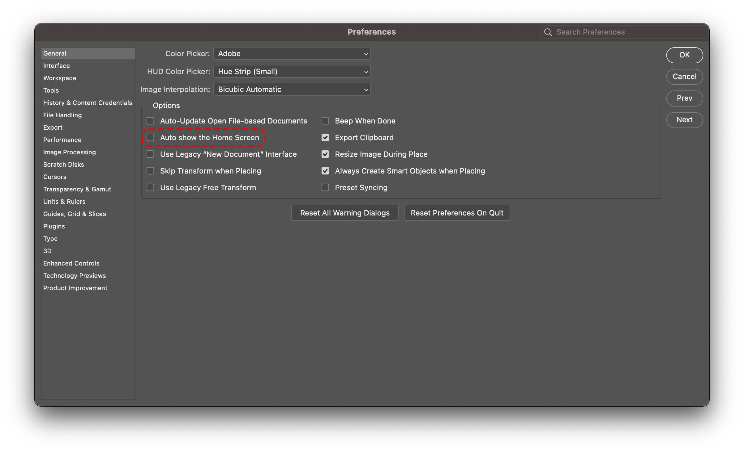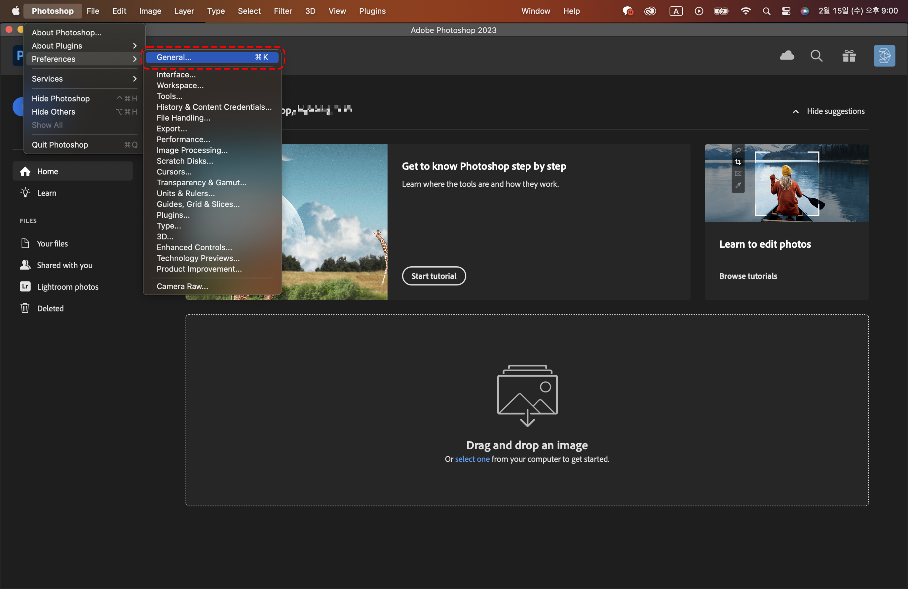이 기능은 포토샵 실행시 첫 화면으로 어도비에서 지원하는 튜토리얼과 웹관련 서비스를 띄워주는 기능입니다.