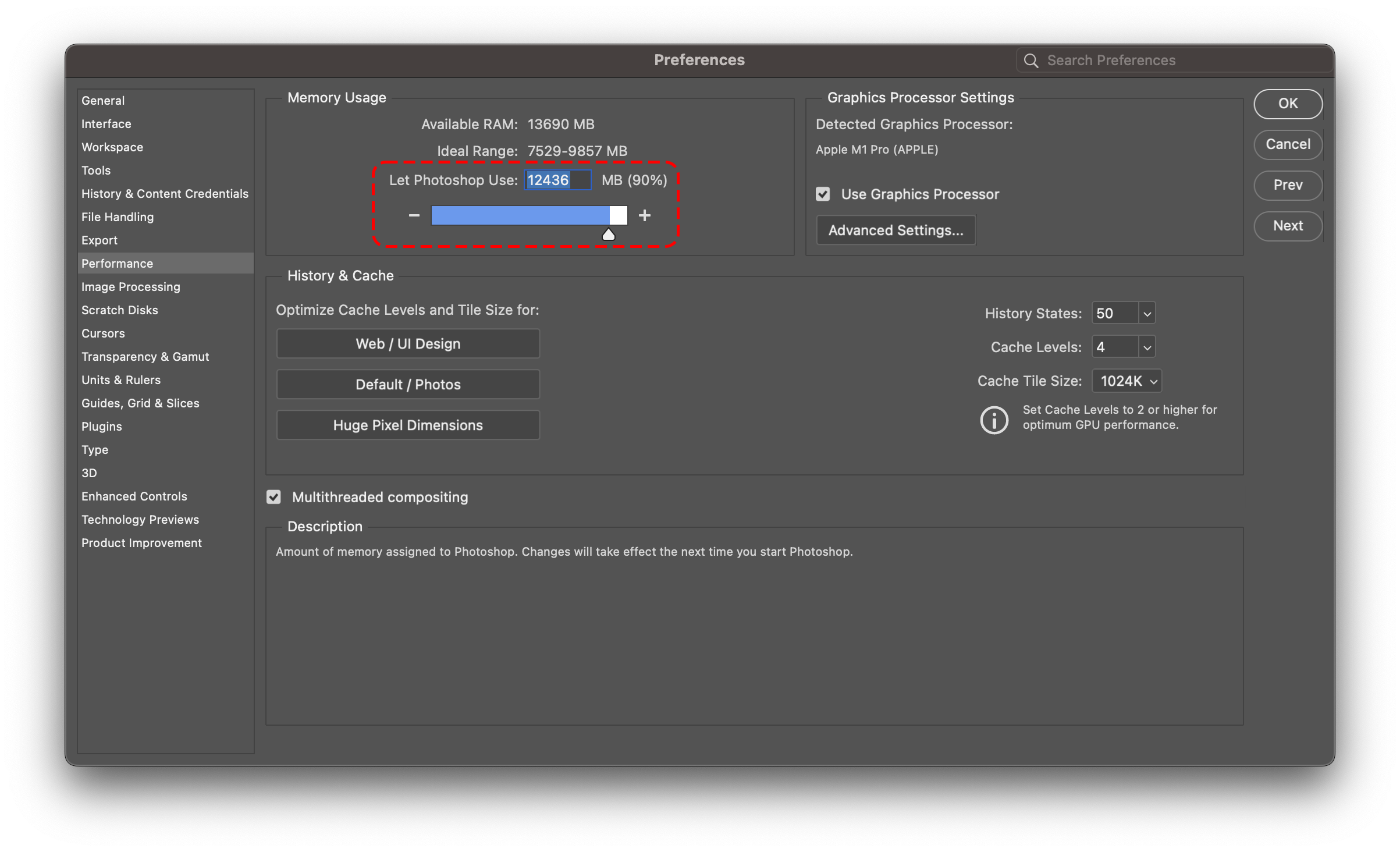 - 퍼포먼스 설정#1 : Performance - Let. Photoshop Use '90%'