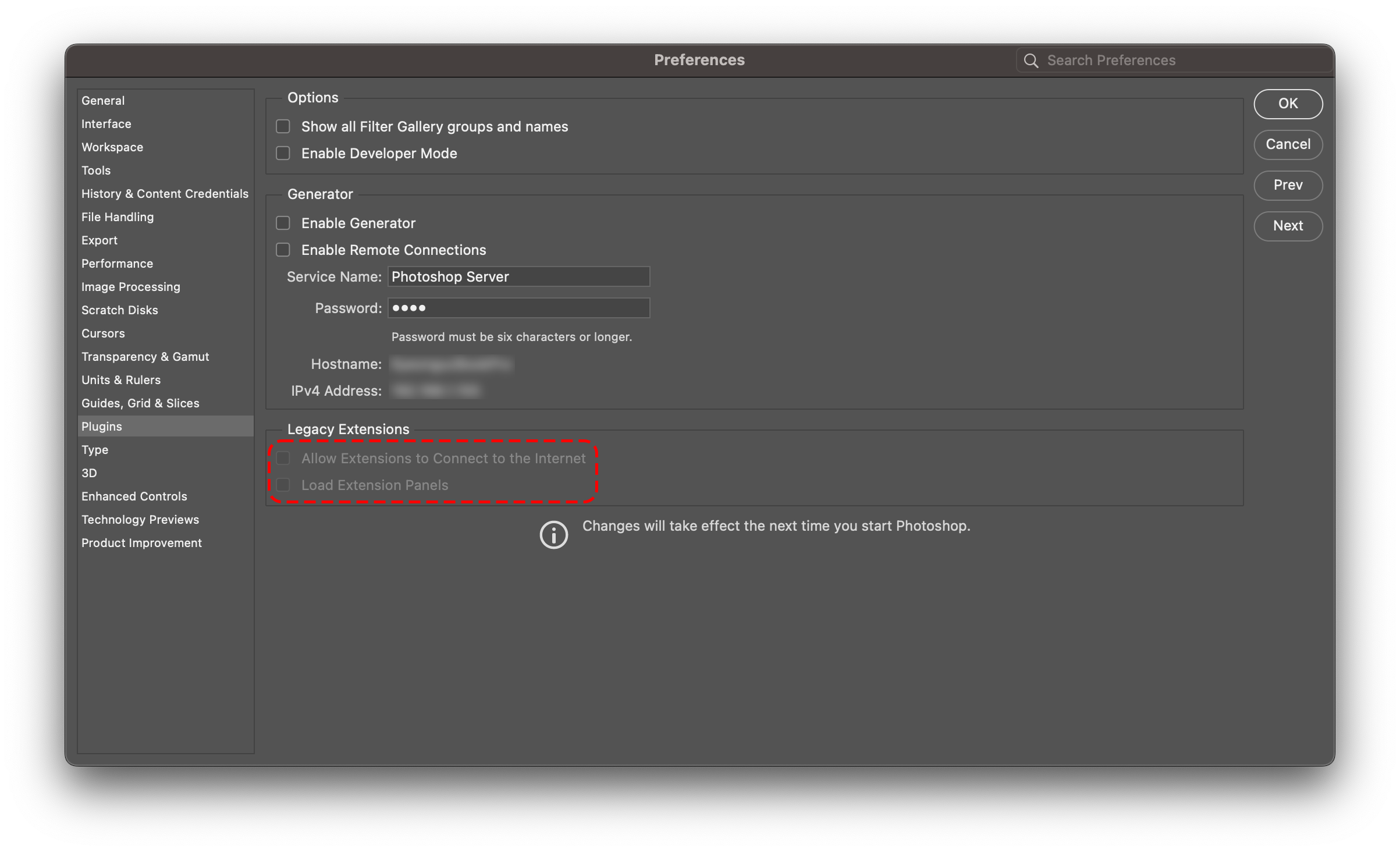 - 플러그인 설정 : Plug-Ins - Allow. Extensions to Connect to the Internet / Load Extention Panels '해제'