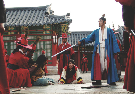한양에 도착한 둘은 저잣거리에서 벌어지는 광대판에 난입합니다. 이미 판을 벌리고 있는 광대 일당(?)들을 자신들의 재주넘기로 제압하고, 그들과 왕을 풍자한 놀이를 계획합니다. 계획은 성공적이었고 많은 구경꾼들의 엽전세례에 정신을 놓을 지경이었습니다. 그러다 환관 김처선에게 발각되어 왕을 모욕했다는 죄명으로 의금부에 끌려갑니다.